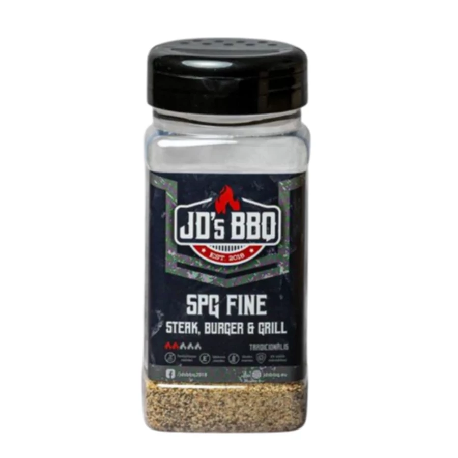 JD’s BBQ Hungary SPG Fine fűszerkeverék a klasszikus SPG (Salt-Pepper-Garlic) fűszerkeverék finomra őrölt változata, amely tökéletes kontrollt biztosít a fűszerezés során. A finomszemcsés só, fekete bors és fokhagyma harmonikus aránya kiemeli az alapanyagok természetes ízét, különösen alkalmas gyorsabb pácoláshoz, szárnyasokhoz, zöldségekhez vagy akár BBQ rubok alapjául.