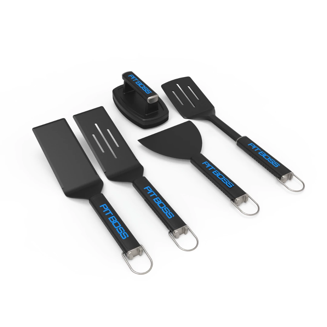 A Pit Boss Ultimate Plancha Kit egy professzionális, 5 részes eszközkészlet, amelyet kifejezetten a plancha és lapos sütők kényelmes, hatékony használatához terveztek. A készlet két Ultimate Plancha spatulát, egy standard spatulát, egy griddle kaparót és egy tisztítókefét tartalmaz. Minden darab tartós nylon polimerből készül, ergonomikus, puha betétes műanyag nyéllel, hogy hosszabb használat során is kényelmes fogást biztosítson.